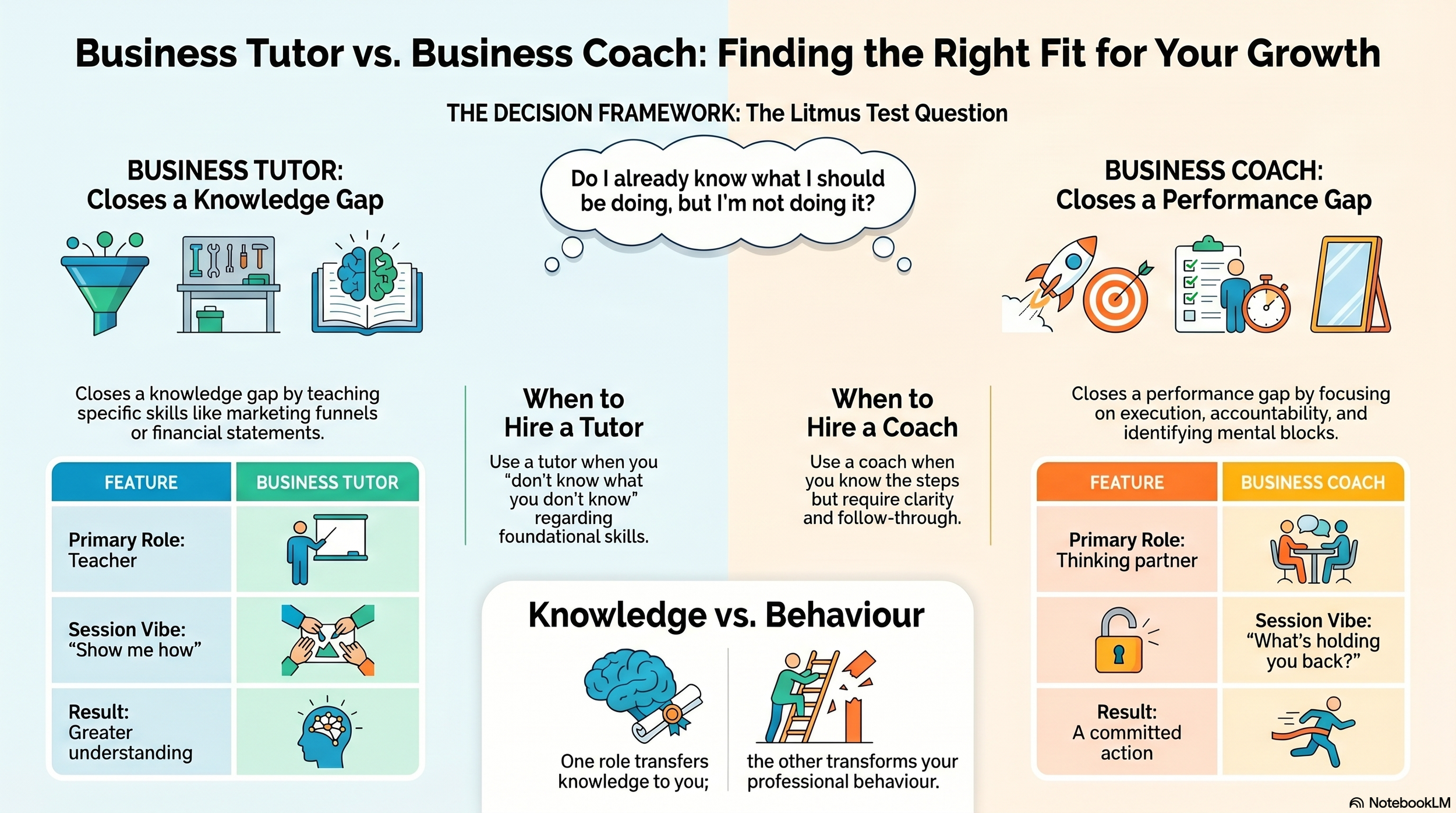 A business tutor helps you learn something. They close a knowledge gap. They teach you how to read a financial statement, build a pricing model, understand your marketing funnel, or write a sales script. Sessions are instructional. You leave knowing more than when you arrived.